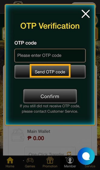 Step 2: Complete OTP Verification – For first-time withdrawals, MILYON88 will send an OTP to your registered phone number. Enter the OTP and click Confirm to verify your account and secure your transaction.