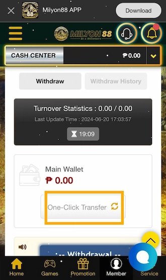 Step 1: Log In and Access Withdraw Section – Log in to your account, navigate to the Member Center, and select Withdraw.