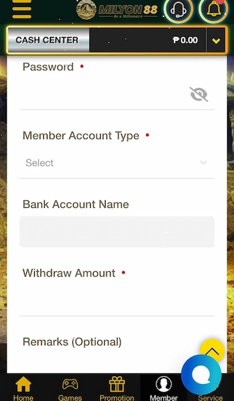 Step 4: Fill in Withdrawal Information – Enter your password, member account type, bank account name, withdrawal amount, and any optional remarks. Double-check all information to avoid mistakes that could delay processing.
