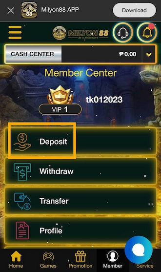 Step 1: Log in to your MILYON88 account via the app or website and go to the Deposit section.
