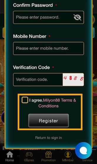 After completing the registration form and verifying all details, tick the box to confirm that you agree with MILYON88’s terms and conditions. Finally, click “Register” to submit your account creation request.
